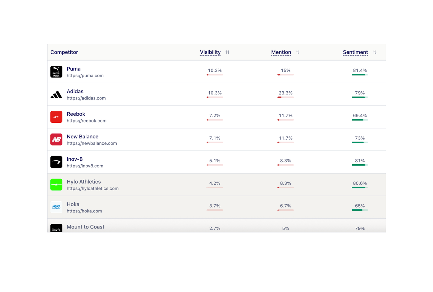 - 60%+ — You're the default recommendation. At this point it's about protecting position: watching competitor moves, keeping content updated, monitoring sentiment.