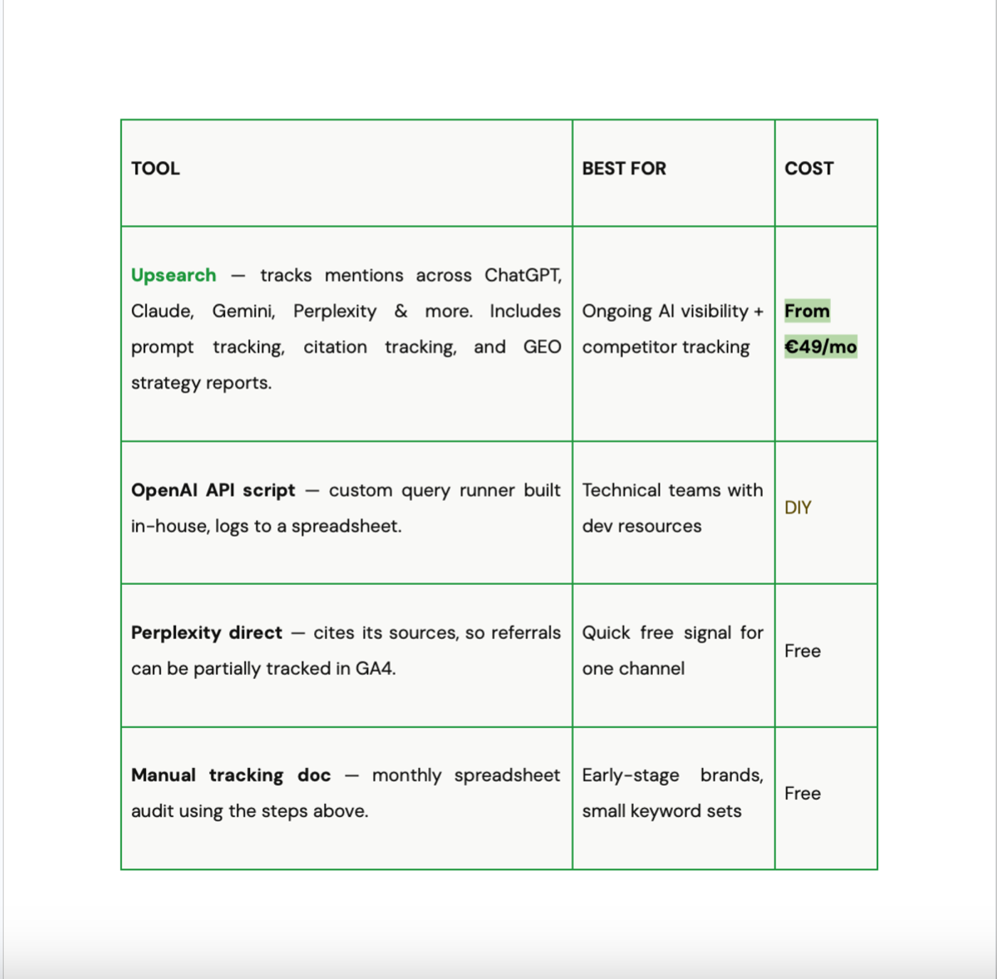 A plain look at how Upsearch tracks brand visibility across AI search tools.